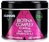 - ⭐ MÁXIMA DOSIS BIOTINA 12.000mcg - La formulación avanzada de la Biotina Complex Aldous contiene en cada comprimido un 20% más de Biotina que las formulaciones que tienen sólo 10.000mcg. Nuestra composición avanzada enriquece la Biotina 12.000mcg de la mejor calidad con Vitaminas, para contribuir al cuidado del cabello, piel y uñas. La combinación de Biotina, Vitaminas, Selenio y Zinc es perfecta para conseguir una piel, pelo y uñas sanas.