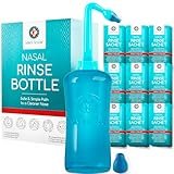 - Completo kit irrigador nasal de adultos e infantil – La ergonómica botella de aclarado nasal con flujo interrumpido incluye sobres de solución para enjuague nasal para un mes, dos puntas para irrigación fuerte o suave, y una bolsa con cordón